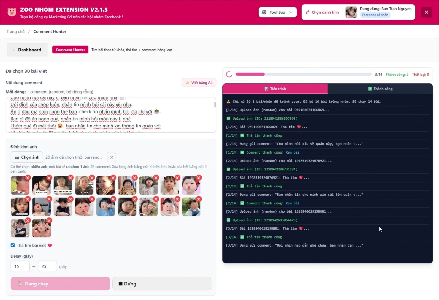 - Thiết lập nội dung comment, viết bằng A.I, cấu hình gửi comment, đính kèm ảnh